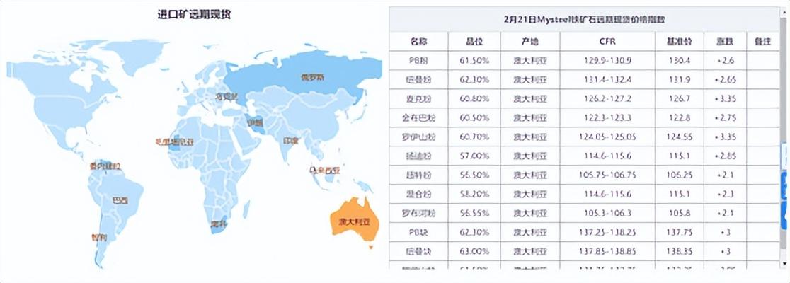 截至2月21日下午收盤,大商所鐵礦石期貨主力合約報(bào)收919元/噸,上漲3.43%,創(chuàng)下近九個(gè)月來(lái)價(jià)格新高,較去年10月底上漲超50%。西南期貨數(shù)據(jù)顯示,目前進(jìn)口礦報(bào)價(jià)已逼近130美元/噸,較今年初上漲約10%。