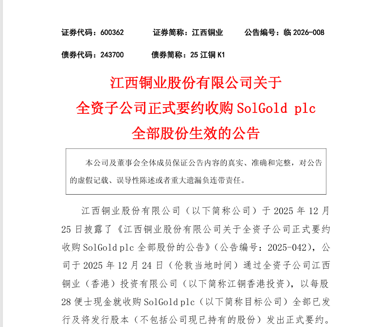 近日,倫敦資本市場傳來重磅消息——中國銅業(yè)龍頭江西銅業(yè)(下稱“江銅”)正式完成對加拿大SolGold公司100%股權(quán)收購,交易對價達8.67億英鎊(約合80億人民幣)。