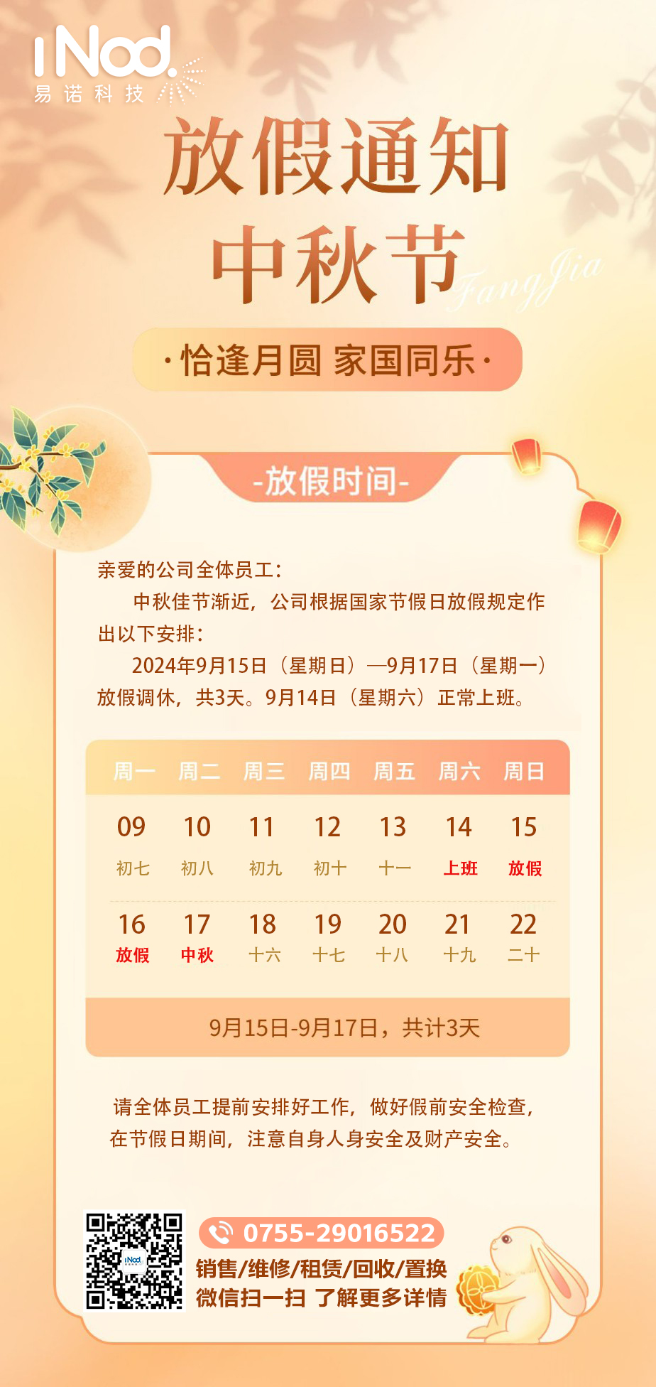易諾科技中秋放假調(diào)休通知