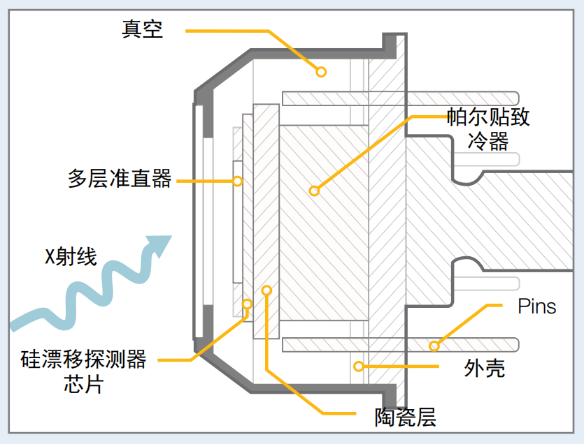 XRF探測(cè)器基本上是由硅晶圓(一種用于探測(cè)X射線的半導(dǎo)體材料)、制冷器和電子器件組成。