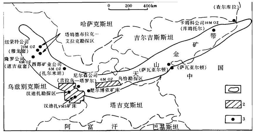 天山西段,從烏茲別克斯坦向東,經(jīng)塔吉克斯坦、吉爾吉斯斯坦到中國新疆,構(gòu)成了世人矚目的巨型金成礦帶,即“亞洲金腰帶”。烏茲別克斯坦、吉爾吉斯斯坦等幾個國家在這條成礦帶上發(fā)現(xiàn)了眾多大型、超大型金礦。其中,最為著名的當(dāng)屬于烏茲別克斯坦的穆龍?zhí)捉鸬V床,該礦是世界級超大型獨立金礦床,遠(yuǎn)景資源儲量預(yù)估1.7億盎司(5287.6噸),平均品位約3.5克/噸。該礦2022年生產(chǎn)了約1700盎司(約48.2噸)的黃金,是全球第二大在產(chǎn)金礦。