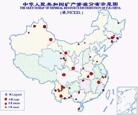中國鎳礦資源不能滿足需要。總保有儲量鎳784萬噸,居世界第9位。鎳礦產(chǎn)地有近100處,分布于18個?。▍^(qū))。