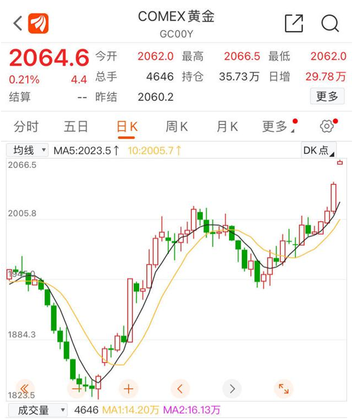 繼上周五國際金價突破2000美元關(guān)口后,11月29日紐約商品交易所COMEX12月黃金期貨持續(xù)收漲,截止29日八點,該指數(shù)暫報2064.7美元,連漲四日且創(chuàng)5月中旬以來的半年新高,也越來越逼近2080美元的歷史最高。