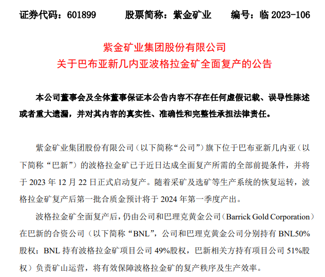 紫金礦業(yè)旗下巴布亞新幾內(nèi)亞波格拉金礦峰回路轉,迎來復產(chǎn)倒計時。12月11日,紫金礦業(yè)發(fā)布公告,宣布波格拉金礦已于近日達成全面復產(chǎn)所需的全部前提條件,并將于2023年12月22日正式啟動復產(chǎn),預計將于2024年第一季度產(chǎn)出第一批合質金。