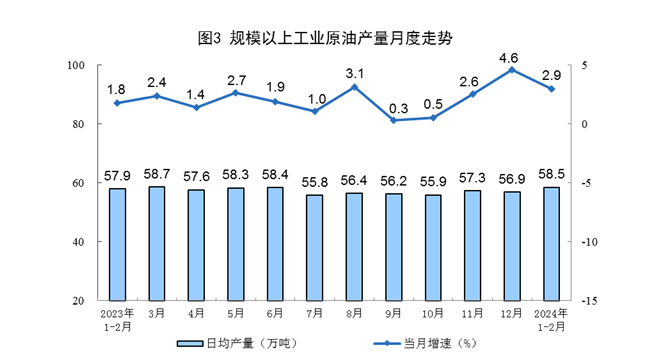 原油生產(chǎn)穩(wěn)定增長,進(jìn)口增速加快。1—2月份,規(guī)上工業(yè)原油產(chǎn)量3511萬噸,同比增長2.9%。進(jìn)口原油8831萬噸,同比增長5.1%,增速比上年12月份加快4.5個百分點(diǎn)。