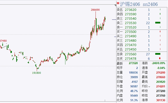 近期,滬錫期貨連續(xù)創(chuàng)下近2年新高,市場(chǎng)小金屬概念逐漸火熱興趣。截至昨日下午收盤,滬錫報(bào)273500元/噸,微跌0.09%。
