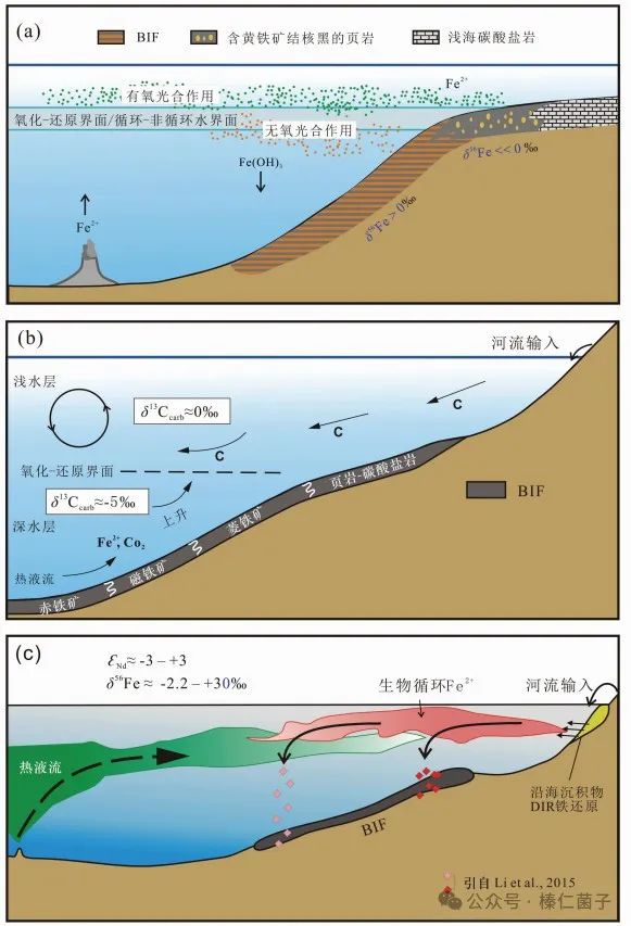 礦床的形成是自然界的選礦、富集過程。鐵比較重要的一個特點是二價鐵如硫酸鐵、氯化鐵等等是溶解于水的,氧化形成的三價鐵是不溶解于水的。“條帶狀赤鐵礦(磁鐵礦)”就是在特定的地質(zhì)歷史時期、地質(zhì)環(huán)境中因為鐵元素的這個特點形成的。
