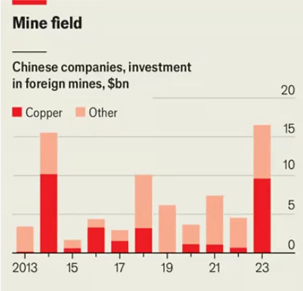在具體礦產(chǎn)投資上,中國公司也非常具有戰(zhàn)略性。《經(jīng)濟學(xué)人》稱,隨著中國在電池、電動汽車和太陽能電池板等產(chǎn)品上越來越具有競爭力,中國對海外礦業(yè)的投資也越來越多。銅礦是電氣化的重要材料,去年中國企業(yè)對這種這礦產(chǎn)的投資約占其海外礦產(chǎn)投資的3/5。