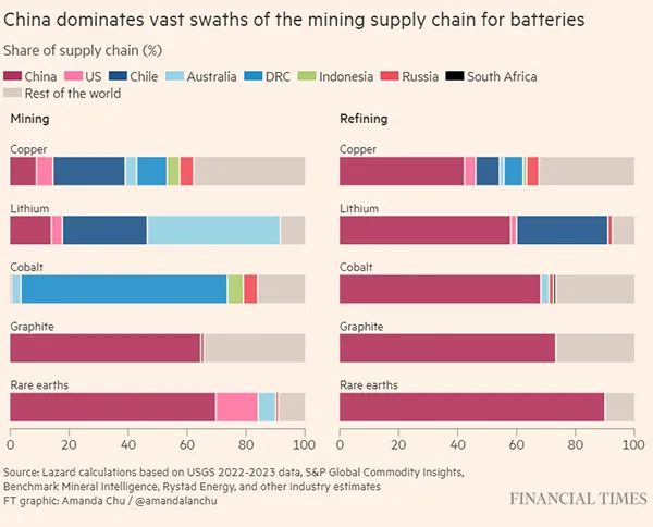 中國在幾種制造電池的關(guān)鍵礦產(chǎn)供應(yīng)鏈中占據(jù)主導(dǎo)地位,深紅色部分代表中國,從上至下列出的礦產(chǎn)分別為銅、鋰、鈷、石墨和稀土。