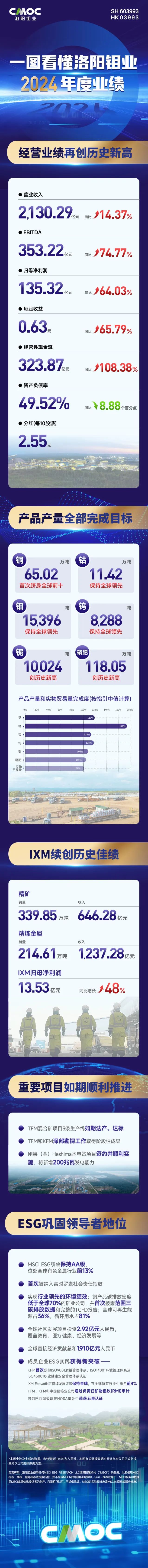 與業(yè)績?cè)鲩L同步,洛陽鉬業(yè)繼續(xù)踐行高標(biāo)準(zhǔn)ESG理念。公司MSCI ESG績效保持AA級(jí),位處全球有色金屬行業(yè)前13%,首次被納入富時(shí)羅素社會(huì)責(zé)任指數(shù)。公司銅產(chǎn)品碳排放密度低于全球70%的礦業(yè)公司,首次披露范圍三碳排放數(shù)據(jù);2024年全球經(jīng)濟(jì)貢獻(xiàn)達(dá)1,910億元,全球社區(qū)投資2.92億元。