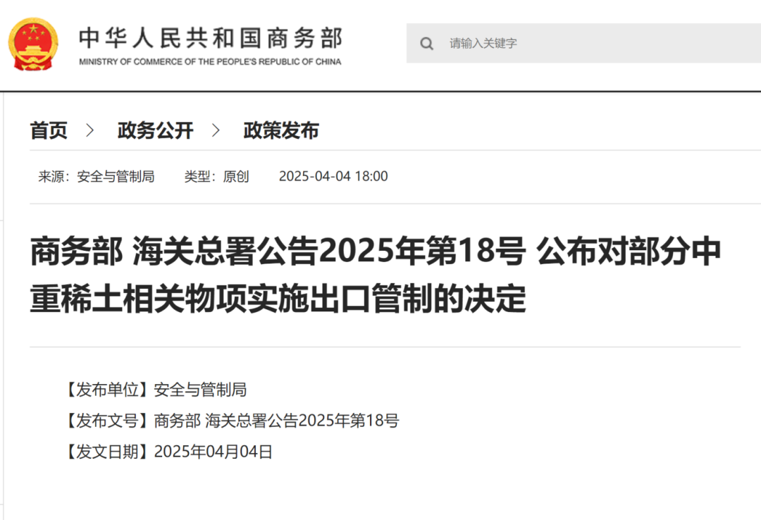 根據(jù)《中華人民共和國(guó)出口管制法》等有關(guān)法律法規(guī),4月4日,商務(wù)部會(huì)同海關(guān)總署發(fā)布關(guān)于對(duì)釤、釓、鋱、鏑、镥、鈧、釔等7類中重稀土相關(guān)物項(xiàng)實(shí)施出口管制措施的公告,并于發(fā)布之日起正式實(shí)施。