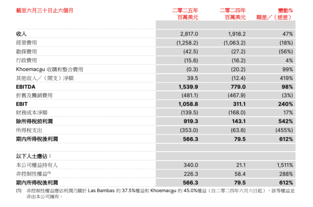 8月12日晚間,五礦資源披露半年業(yè)績,2025年上半年,五礦資源實現(xiàn)收入28.17億美元,同比增長47%;除稅后利潤達(dá)5.663億美元,與上年同期的0.795億美元相比,實現(xiàn)了612%增長;公司權(quán)益持有人應(yīng)占利潤3.40億美元,與上年同期的0.211億美元相比,實現(xiàn)了超過15倍的增長。