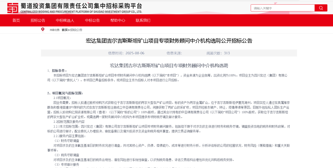 消息源于蜀道投資集團(tuán)集中招標(biāo)采購平臺發(fā)布的《宏達(dá)集團(tuán)吉爾吉斯斯坦礦山項目專項財務(wù)顧問中介機(jī)構(gòu)選聘公開招標(biāo)公告》。公告顯示,宏達(dá)集團(tuán)計劃收購億陽資源有限公司 (香港) 100% 股權(quán),通過這一操作,將間接掌控中亞錫有限責(zé)任公司100% 股權(quán),進(jìn)而獲取位于吉爾吉斯斯坦伊塞克湖州的兩宗大型在產(chǎn)礦山礦業(yè)權(quán)。為順利推進(jìn)收購,宏達(dá)集團(tuán)正在公開選聘一家財務(wù)顧問中介機(jī)構(gòu),為項目提供專項財稅盡調(diào)及審計服務(wù),項目資金全部來源于企業(yè)自籌。