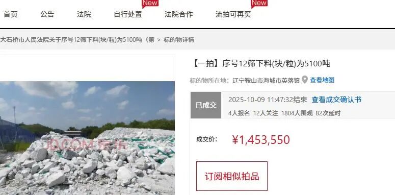 10月9日,在國(guó)慶假期后第一天,在遼寧鞍山市司法拍賣(mài)市場(chǎng)上,就迎來(lái)了一宗特別而搶手的拍賣(mài),一批石頭被拍賣(mài)。此次拍賣(mài)的石頭比較特別,不是普通石頭,而是鎂礦石,當(dāng)然,這些礦石看上去也是非常特別,沒(méi)有經(jīng)過(guò)加工冶煉就是普通的石頭。此次拍賣(mài)的石礦為遼南鎂礦耐火材料廠(chǎng)青山懷鎂礦所有,礦石總重量為5100噸。遼南鎂礦耐火材料廠(chǎng)青山懷鎂礦位于鞍山市海城市英落鎮(zhèn)。