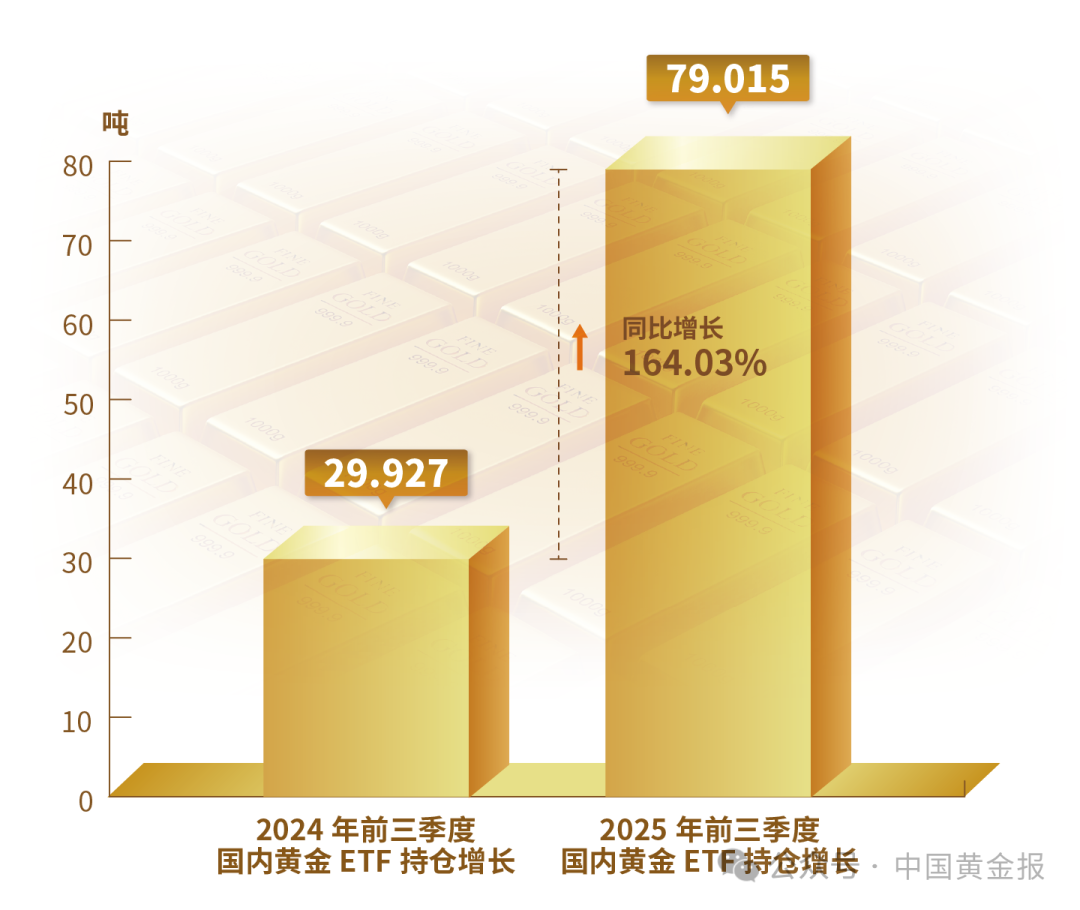 2025年前三季度,國內(nèi)黃金ETF增倉量為79.015噸,較2024年前三季度增倉量29.927噸,同比增長164.03%。至9月底,國內(nèi)黃金ETF持倉量為193.749噸。