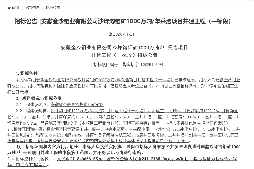 股權(quán)合作敲定僅兩日,1月21日,沙坪溝鉬礦便迎來實(shí)質(zhì)建設(shè)關(guān)鍵動(dòng)作——安徽金沙鉬業(yè)有限公司發(fā)布沙坪溝鉬礦1000萬噸/年采選項(xiàng)目井建工程(一標(biāo)段)招標(biāo)公告(項(xiàng)目編號(hào):紫金招字〔2025〕89號(hào)),由福建紫金工程技術(shù)有限公司擔(dān)任招標(biāo)代理,標(biāo)志著項(xiàng)目從審批階段正式轉(zhuǎn)入工程實(shí)施環(huán)節(jié),資源變現(xiàn)時(shí)間表進(jìn)一步清晰。本次招標(biāo)聚焦井下核心設(shè)施建設(shè),招標(biāo)控制價(jià)(含稅)約2.72億元,涵蓋主副井、井塔及配套系統(tǒng),是300億總投資項(xiàng)目落地的重要開篇。