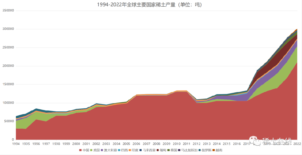 2022年全球稀土礦產(chǎn)量竟達(dá)到了30萬噸,而中國(guó)占比提升至70%